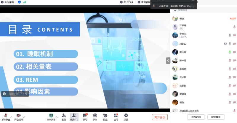 随后,23级临床三班田依熙同学详细解读了REM睡眠的特征、功能以及影响因素,并强调了REM睡眠对于记忆巩固、情绪调节和大脑发育的重要性。通过此次活动,听众不仅加深了对REM睡眠的理解,还获得了改善睡眠质量、促进身心健康的实用建议,为打造更优质的睡眠环境提供了科学指导。