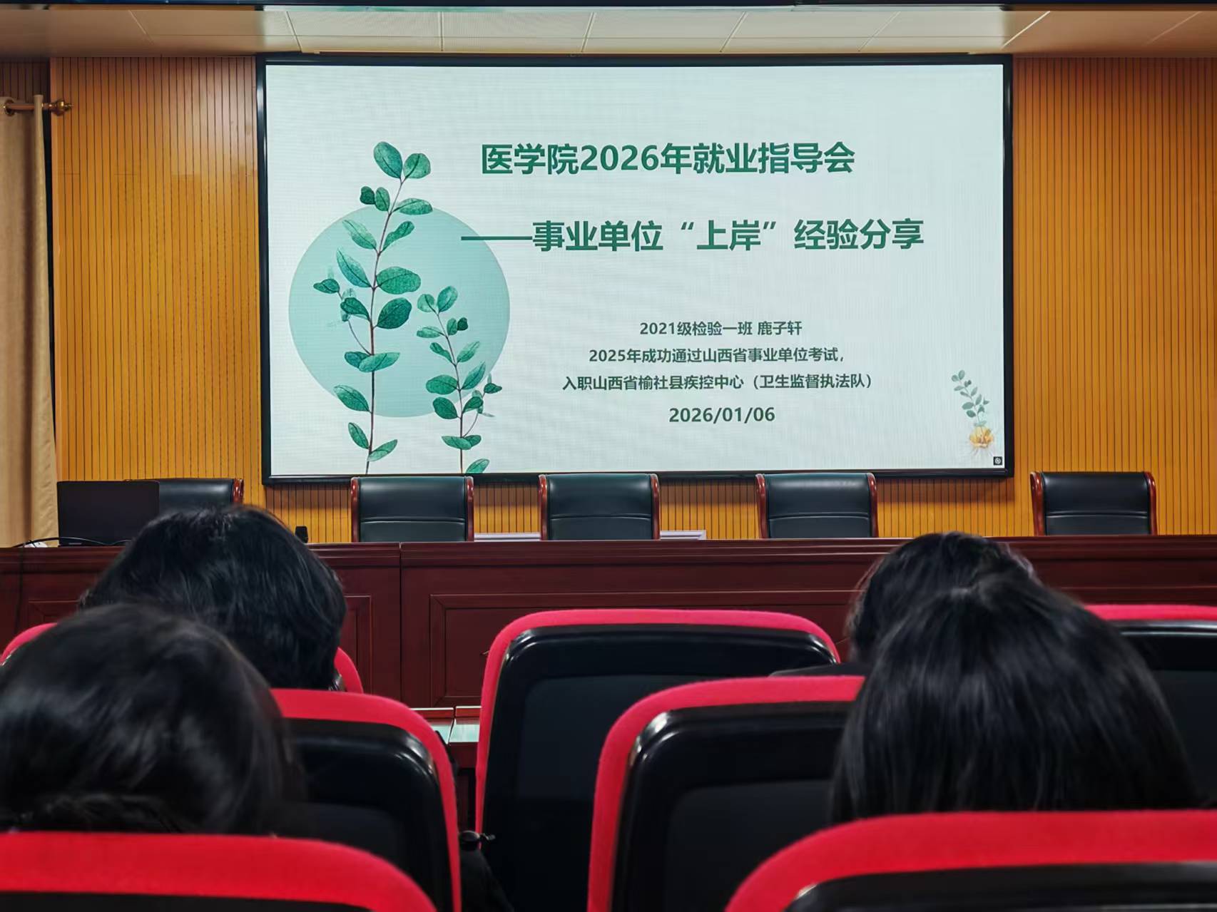 为精准助力tyc8722太阳集团2026届毕业生实现高质量就业,清晰把握事业单位报考流程与备考策略,1月6日晚七点,tyc8722太阳集团在仁和楼五楼报告厅成功举办了2026年就业指导会。本次分享会特别邀请了2021级医学检验技术专业一班,已于2025年成功考入山西省榆社县疾病预防控制中心(卫生监督执法队)的鹿子轩,通过线上学习通平台,为在校医学生带来了一场内容丰富、实用性强的"上岸"经验分享。本次活动采用线上与线下相结合的形式同步进行,吸引了260余人参加,tyc8722太阳集团团委书记谢丽君担任活动主持人。