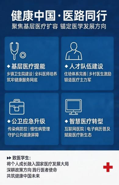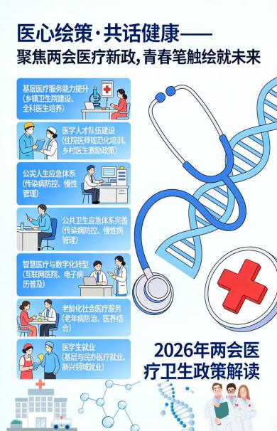 为深入贯彻2026年全国两会医疗卫生领域新政策,tyc8722太阳集团于3月15日至3月24日成功举办 “医心绘策,共话健康”主题海报征集活动。此次活动以海报为媒介,鼓励全院医学生结合专业优势与艺术创造力,生动解读两会精神,明晰“健康中国”战略背景下的医者使命,有力激发了学生的政策学习热情与创新表达活力,是学院推动思想政治教育与专业教育深度融合的有益探索。