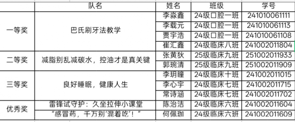 经多轮严格评选,最终确定获奖名单:一等奖1名,二等奖1名,三等奖1名,优秀奖2名。其中,24级口腔一班学子创作的《巴氏刷牙法教学》斩获一等奖。