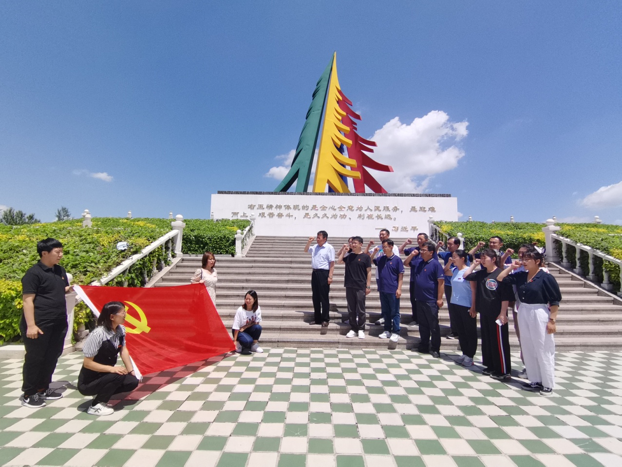 第二站是南山森林公园。车在林海中穿行,山风拂过,松涛阵阵,展示着右玉人民绿化山川、改造山河的巨大业绩。在南山森林公园丰碑前所有人面对党旗庄严宣誓,重温入党誓词和习近平总书记关于“右玉精神”的重要批示和指示精神,感受“迎难而上、艰苦奋斗,久久为功、利在长远”的内涵真谛,进一步明晰右玉精神的时代意义,坚定理想信念,把学习右玉精神、落实右玉精神贯穿到实际工作中,立足岗位,转变作风,扎实工作。