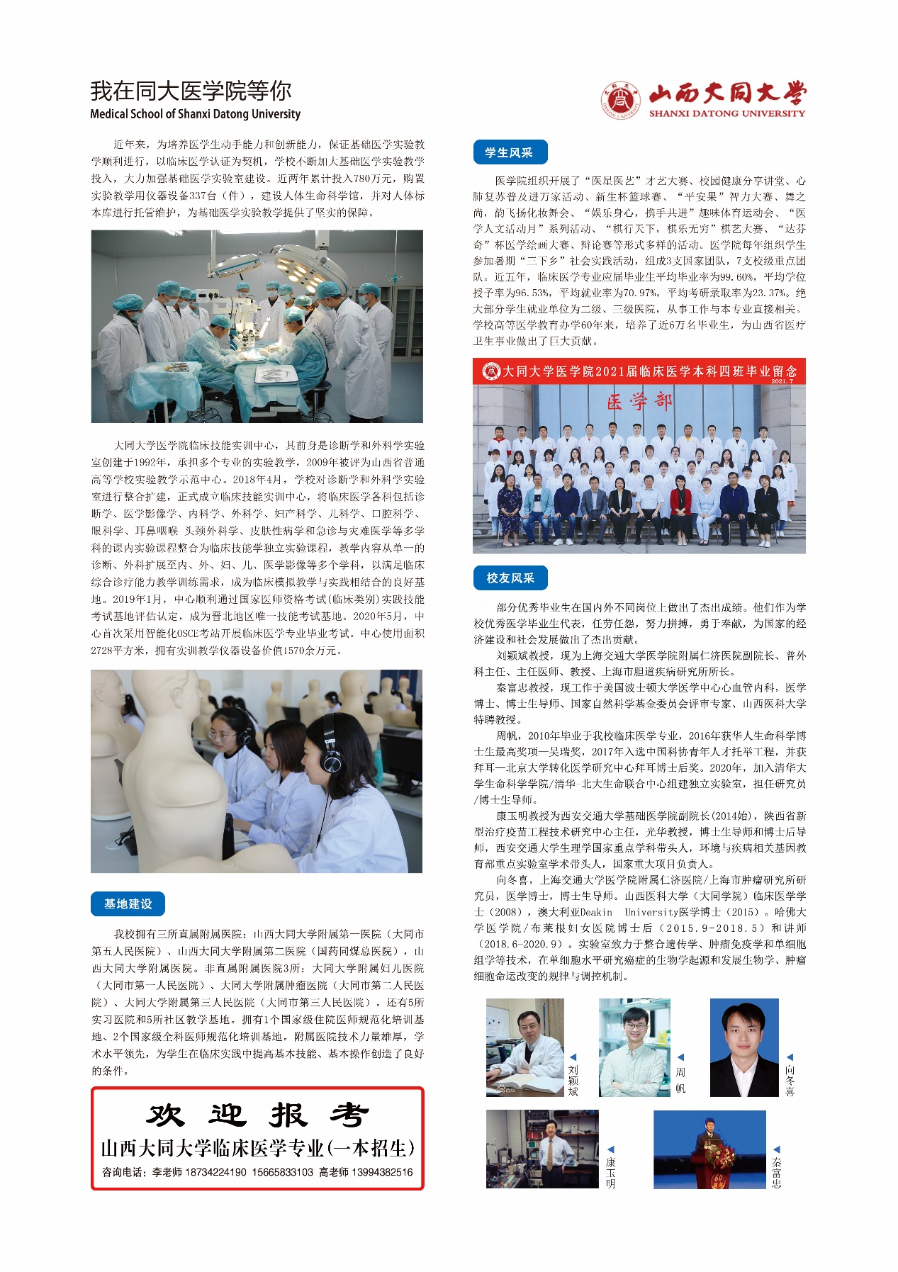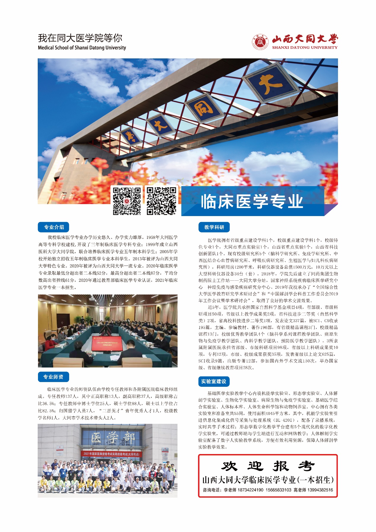 临床医学专业办学历史悠久、办学实力雄厚。1958年大同医学高等专科学校建校,开设了三年制临床医学专科专业;1999年成立山西医科大学大同学院,联合培养临床医学专业五年制本科学生;2005年学校开始独立招收五年制临床医学专业本科学生。2013年被确定为太阳集团城娱8722特色专业。2020年确定为太阳集团城娱8722一流专业。2020年临床医学专业录取最低分超出省二本线52分,最高分超出省二本线87分,平均分数高出省控线61分,2020年通过教育部临床医学专业认证,2021年临床医学专业一本招生。