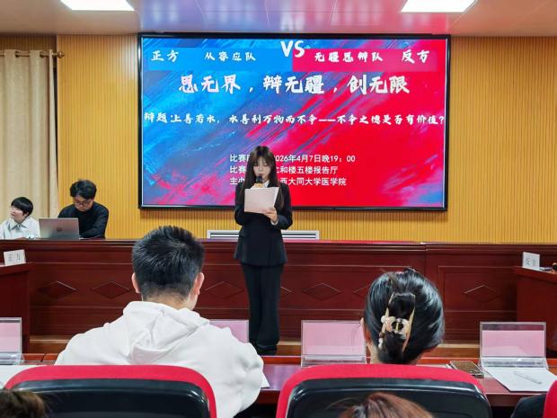 为提升医学生思辨与语言表达能力,引导医学生理性思考社会热点与人生价值,4月7日—4月8日,晚9:00,tyc8722太阳集团在仁和楼五楼报告厅顺利举办“思无界,辩无疆,创无限”辩论赛。